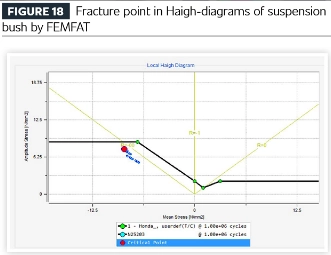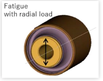 सस्पेंशन बुशिंगसाठी थकवा सिम्युलेशन परिणामांचे हाय डायग्राम कंप्रेसिव्ह स्ट्रेस रेशो अंतर्गत फ्रॅक्चर प्रकट करते. जरी तन्य आणि संकुचित भार रबर सामग्रीवर समान रीतीने लागू केले गेले असले तरी, विश्लेषण दर्शवते की अपयश शेवटी संपीडन अंतर्गत सुरू होते.