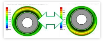 खालील आकृती रेडियल लोड अंतर्गत विशिष्ट सस्पेंशन बुशिंगचे मर्यादित घटक मॉडेल आणि गणना परिणामांचे समोच्च प्लॉट दर्शवते.