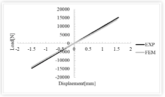 बुशिंग कडकपणा वक्र (फोर्स-डिस्प्लेसमेंट वक्र) प्रायोगिक परिणामांशी तुलना केली जाते, पुढे स्थापित FEM मॉडेलची वैधता सिद्ध करते. आकृतीवरून पाहिले जाऊ शकते: सामग्री चाचणी नमुन्यांमधून ओळखल्या जाणाऱ्या हायपरलेस्टिक पॅरामीटर्सचा वापर करून विश्लेषण लोड-डिस्प्लेसमेंट डायग्रामवरील प्रायोगिक आणि विश्लेषणात्मक परिणामांमध्ये चांगली सुसंगतता दर्शवते.