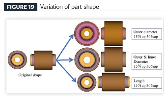[थकवा विश्लेषण तंत्रज्ञानाद्वारे एक कार्यक्षम वाहन उत्पादन डिझाइन प्रक्रिया स्थापित करणे] कंपन-विलग करणाऱ्या रबर घटकांसाठी प्रस्तावित थकवा विश्लेषण तंत्राचा वापर करून, भूमितीय भिन्नता (रबर व्हॉल्यूम) आणि टिकाऊपणा कार्यप्रदर्शन यांच्यातील संबंध तपासण्यासाठी समान सामग्रीपासून बनवलेल्या घटकांवर पॅरामेट्रिक अभ्यास केला गेला. घटक भूमिती मूळ भाग डिझाइनमधून प्राप्त केली गेली होती, ज्यामध्ये मॉडेल केलेल्या भिन्नतेचा समावेश आहे: