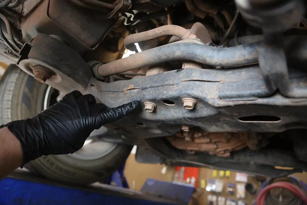 आमच्या FWD डेमो वाहनावर, ट्रान्समिशन माउंट समोरच्या सबफ्रेमवर ट्रान्समिशनच्या मागे स्थित आहे. तुमच्याकडे AWD, 4WD, किंवा RWD वाहन असल्यास, माउंट बहुधा ट्रान्समिशनच्या अगदी मागील बाजूस आहे, जवळजवळ थेट कारच्या खाली, ट्रान्समिशन आणि क्रॉसमेम्बर दरम्यान मध्यभागी आहे.