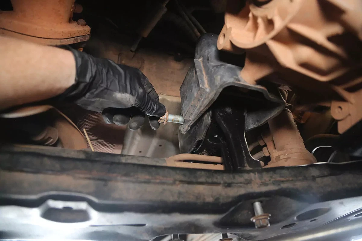 क्रॉसबोल्ट काढा. त्यानंतर, चेसिसमधून ट्रान्समिशन माउंट बोल्ट काढा.