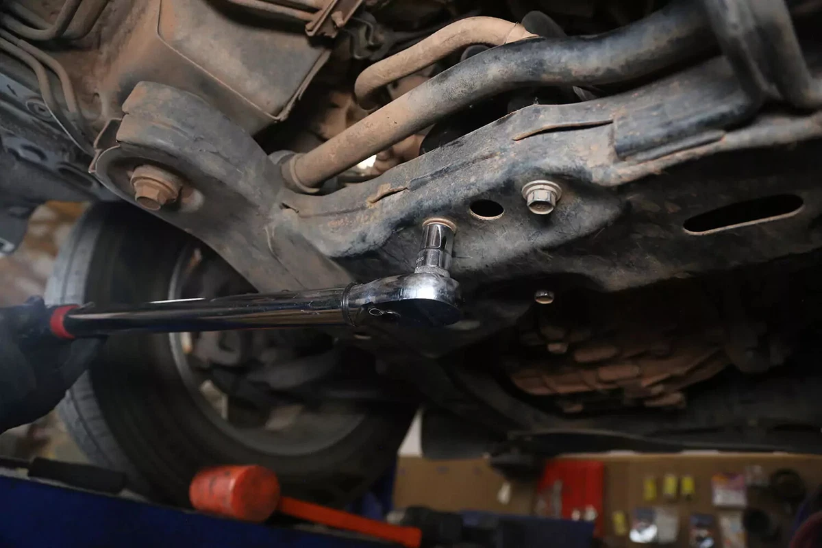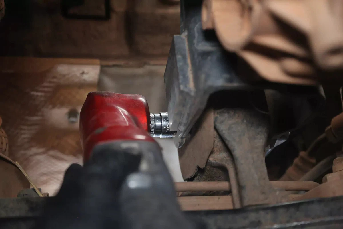 आमच्या डेमो वाहनात क्रॉसबोल्ट आहे, जो एका बाजूला रिंच आणि दुसऱ्या बाजूला सॉकेट वापरून काढला जातो. हे घट्ट क्वार्टरमध्ये काढणे कठीण असू शकते. आवश्यक फायदा मिळवण्यासाठी ब्रेकर बार, इम्पॅक्ट रेंच किंवा चीटर बार वापरा.