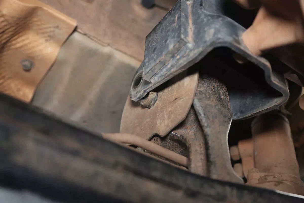 आमच्या डेमो वाहनावर, ट्रान्समिशन माउंट ब्रॅकेटमध्ये माउंट लॉक करणाऱ्या सपोर्ट नॉचेस आहेत. माउंट फ्री मिळविण्यासाठी आम्हाला अतिरिक्त लिफ्ट लागू करणे आवश्यक आहे.