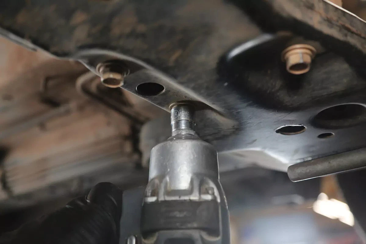 आमच्या डेमो वाहनासाठी, माउंटला सबफ्रेमवर तीन बोल्ट आणि ट्रान्समिशनला एक बोल्ट आहे. आणखी चार बोल्ट ट्रान्समिशन माउंट ब्रॅकेटला ट्रान्समिशनला जोडतात. बहुतेक वाहनांवर, ते काढण्याची गरज नाही.